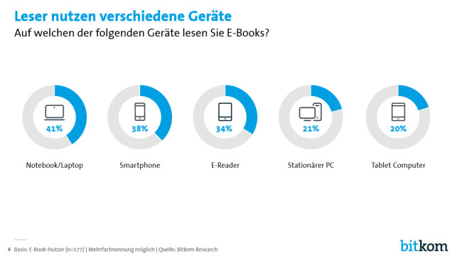 Auch die jüngste Bitkom-Umfrage bestätigt dieses Bild indirekt: Demnach nutzen 34 Prozent der Digitalleser eReader zum Lesen von eBooks. 38 Prozent verwenden das Smartphone und nur 20 Prozent den Tablet-PC. Dabei ist allerdings fraglich, was unter dem Begriff eBook zusammengefasst wird. Zählen dazu auch beliebige PDF-Texte die man im Internet zuhauf findet, oder handelt es sich ausschließlich um in Shops gekaufte Werke?