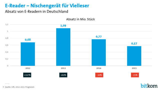 Zum einen hat Bitkom vor wenigen Tagen die Verkaufsprognose für dedizierte Lesegeräte für das heurige Jahr veröffentlicht. Demnach können in Deutschland im Jahr 2015 vermutlich nur 570.000 Geräte abgesetzt werden. 2014 waren es noch 770.000, 2013 1,09 Millionen und 2012 680.000.