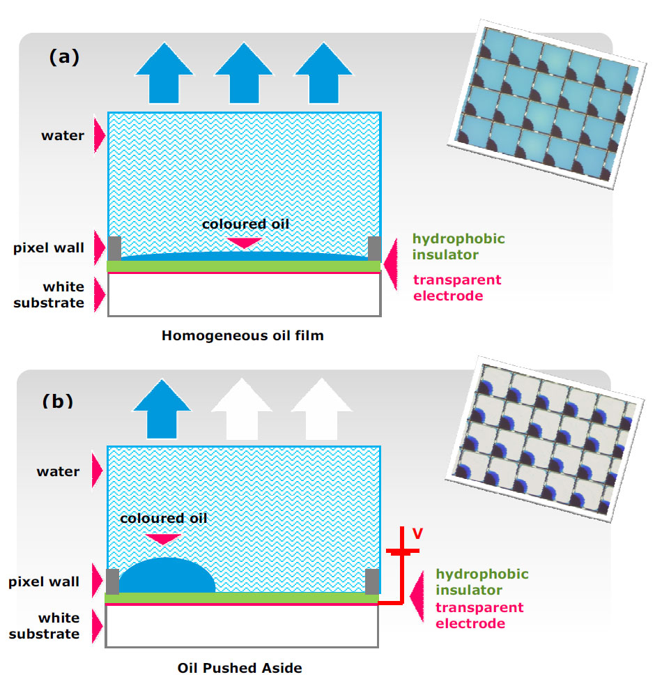 Die neue Bildschirmtechnologie hat gegenüber traditionieller elektrophoretischer E-Ink Technik eine Reihe von Vorteilen. Wie aktuell übliche E-Ink Displays, können Electrowetting-Bildschirme rein reflektiv betrieben werden, was bedeutet, dass keine Hintergrundbeleuchtung zum Einsatz kommt und die Ablesbarkeit vom einfallenden Licht abhängt. Je heller die Umgebung, desto besser lässt sich das Display ablesen. Alternativ kann die Technik auch transflektiv oder transmissiv genutzt werden, was weitere Anwendungsmöglichkeiten eröffnet.
