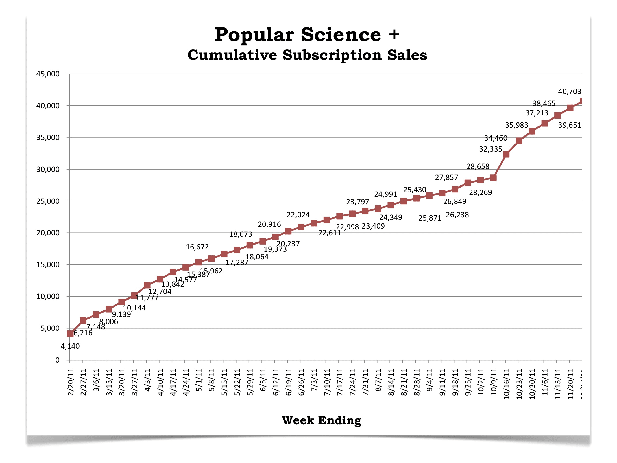 Popular Science konnte die Abonnements zum Start des Newsstand um ca. 13 Prozent, von 28.685 auf 32.335 Stück, steigern. Gut – aber nicht so ungewöhnlich. Viel sehenswerter sind die Wachstumszahlen der darauf folgenden Wochen. Hier konnte man nämlich ein stärkeres Wachstum als die vorangegangenen Monate beibehalten. Insgesamt stieg die Zahl der Abonnements seit der Newsstand-Einführung bis Anfang Dezember, von 28.685 auf 40.703. Das entspricht einem Wachstum von fast 42 Prozent – in nur 7 Wochen. Für das gleiche Wachstum hatte man zuvor noch 17 Wochen gebraucht.