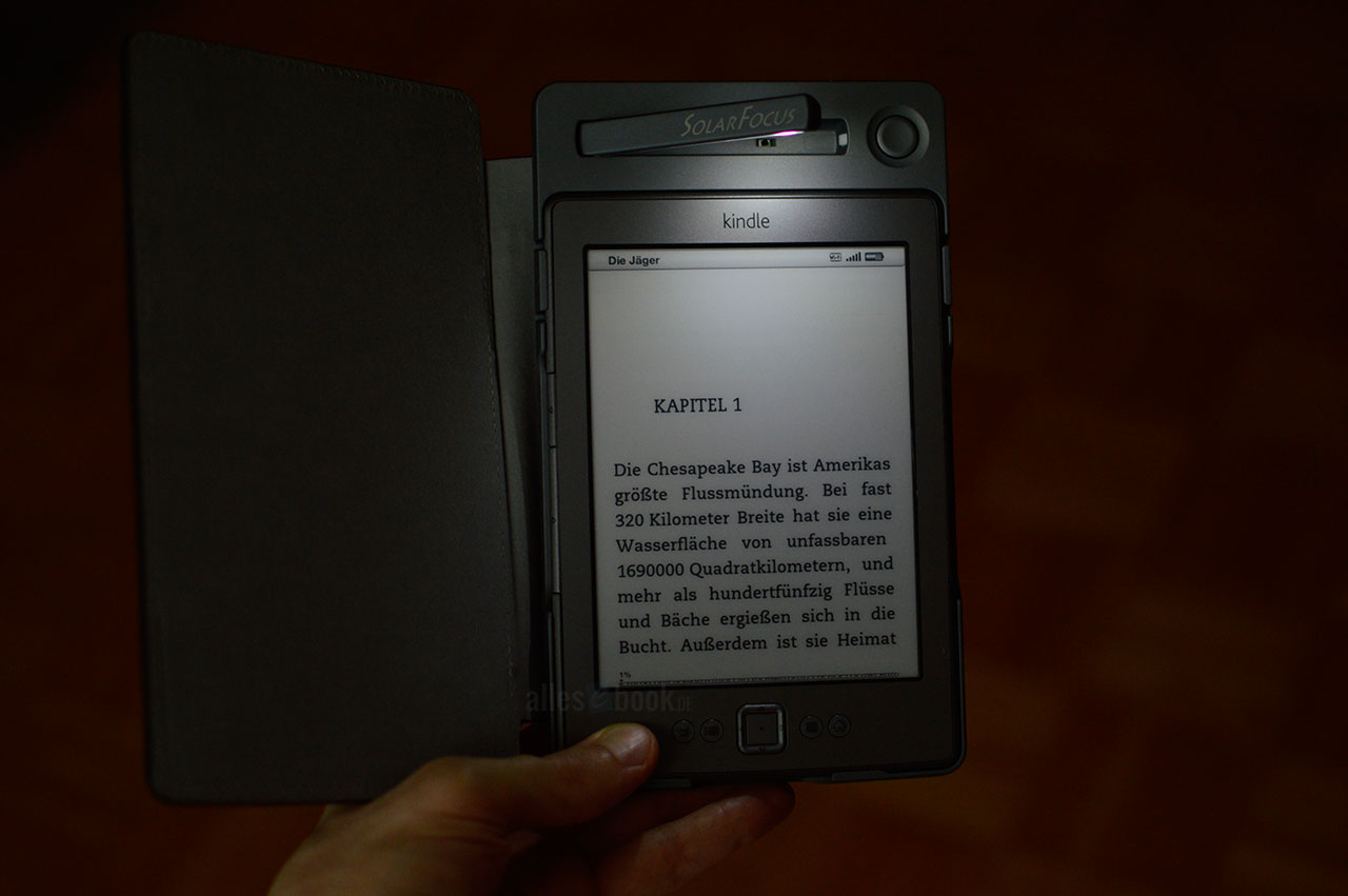 Hüllen für eBook Reader und insbesonders für den Kindle 4 gibt es viele. Einen wirklich interessanten Ansatz liefert nun die Firma SolarFocus mit seinem SolarKindle Lighted Cover. Dieses bietet nämlich nicht nur Schutz für den eBook Reader sowie eine eingebaute Beleuchtung, sondern liefert auch gleich die Stromquelle mit. Das SolarKindle Lighted Cover ist nämlich, wie bereits der Name verrät, mit Solarzellen ausgestattet und kann damit bei entsprechender Lichteinstrahlung sowohl den Kindle als auch die Leselampe aufladen.