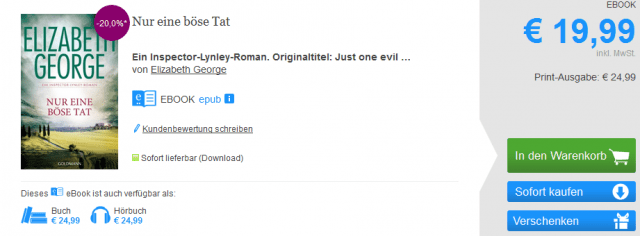 Der Roman „Nur eine böse Tat“ von Elizabeth George ist im November dieses Jahres erschienen. Zunächst nur als Hardcover für 24,99 Euro, was ja nicht ungewöhnlich ist. Die digitale Preisgestaltung ist dann aber fragwürdig, denn das eBook kostet genauso viel wie die gebundene Ausgabe: 24,99 Euro. Klar, für die eBook-Erstellung fallen auch Kosten an, aber das digitale Gut völlig ohne Rabatt zum Hardcoverpreis zu verkaufen, ist schon ein wenig dreist. Da darf man sich auch nicht wundern, wenn das eBook pirateriert wird. Und nein, das ist keine Legitimation für Piraterie, sondern eine Sachverhaltsdarstellung die sich die Verantwortlichen wirklich zu Herzen nehmen sollten.