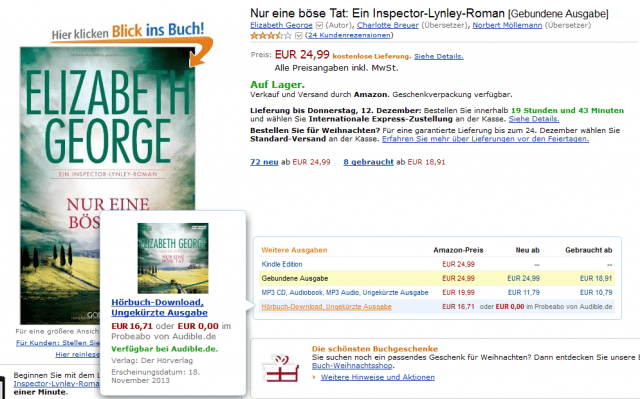 Dabei gilt es zwar zu bedenken, dass Hörbücher nicht der Buchpreisbindung unterliegen, aber „Nur eine böse Tat“ ist kein Einzelfall. Auch eine Reihe anderer eBooks sind im Vergleich zu den Hörbüchern viel zu teuer. So z.B. auch das Krimi-Debüt von Harry Potter Autorin J.K Rowling. „Der Ruf des Kuckucks“ kostet als eBook 18,99 Euro, als ungekürzter Hörbuchdownload bei Audible hingegen nur 15,78 Euro (eBook.de: 15,30 Euro).