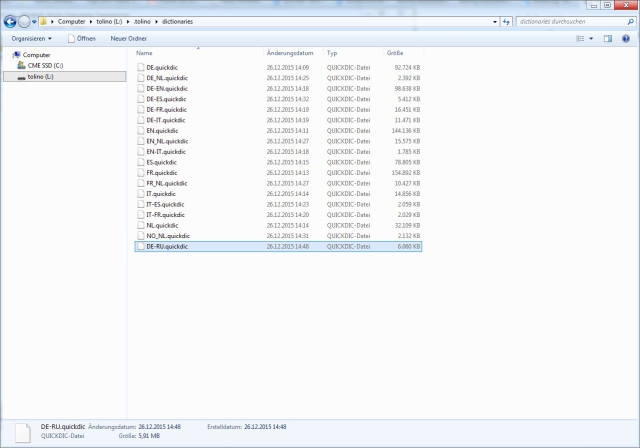 - Die ZIP-Dateien entpackt man in ein beliebiges Verzeichnis. Man erhält Dateien mit der Endung „quickdic“. In unserem Fall heißt die Datei „DE-RU.quickdic“.