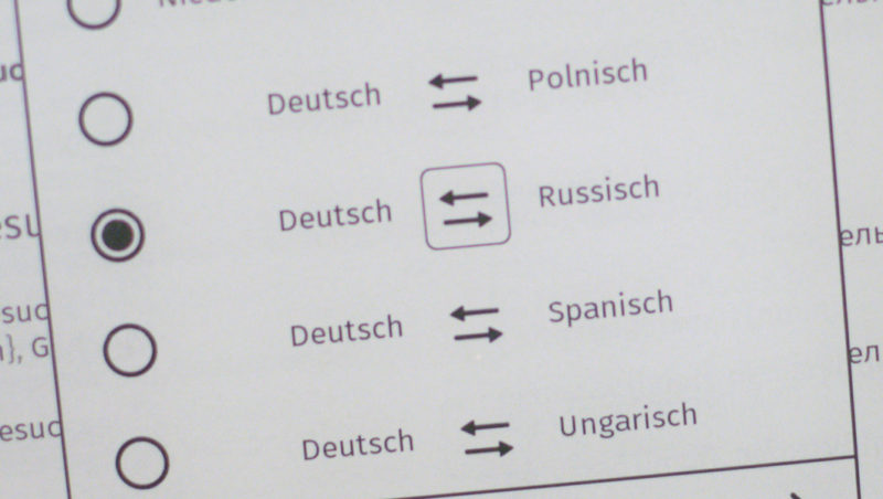 Das war’s. Wenn man den eBook Reader wieder vom PC absteckt und ein Wort nachschlagt, hat man die Option das neu hinzugefügte Wörterbuch auszuwählen. Die Übersetzung funktioniert in beide Richtungen.