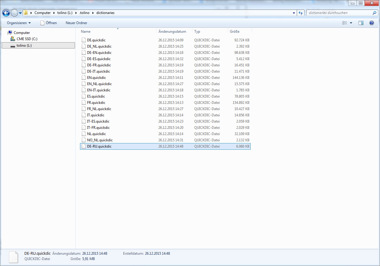 - Die ZIP-Dateien entpackt man in ein beliebiges Verzeichnis. Man erhält Dateien mit der Endung „quickdic“. In unserem Fall heißt die Datei „DE-RU.quickdic“.