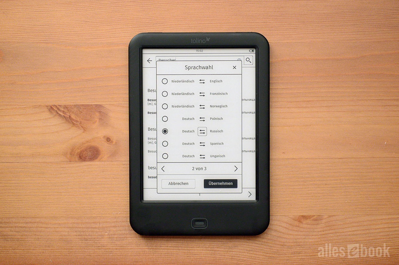 Mittlerweile ist die Wörterbuchfunktion natürlich auf jedem Tolino eBook Reader vorhanden. D.h. nicht nur der erste Shine, sondern auch die jüngsten Modelle Tolino Shine 2 HD, Tolino Vision 3 HD und Tolino Page bieten eine Option um Wörter nachzuschlagen und zu übersetzen.