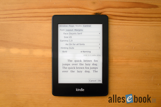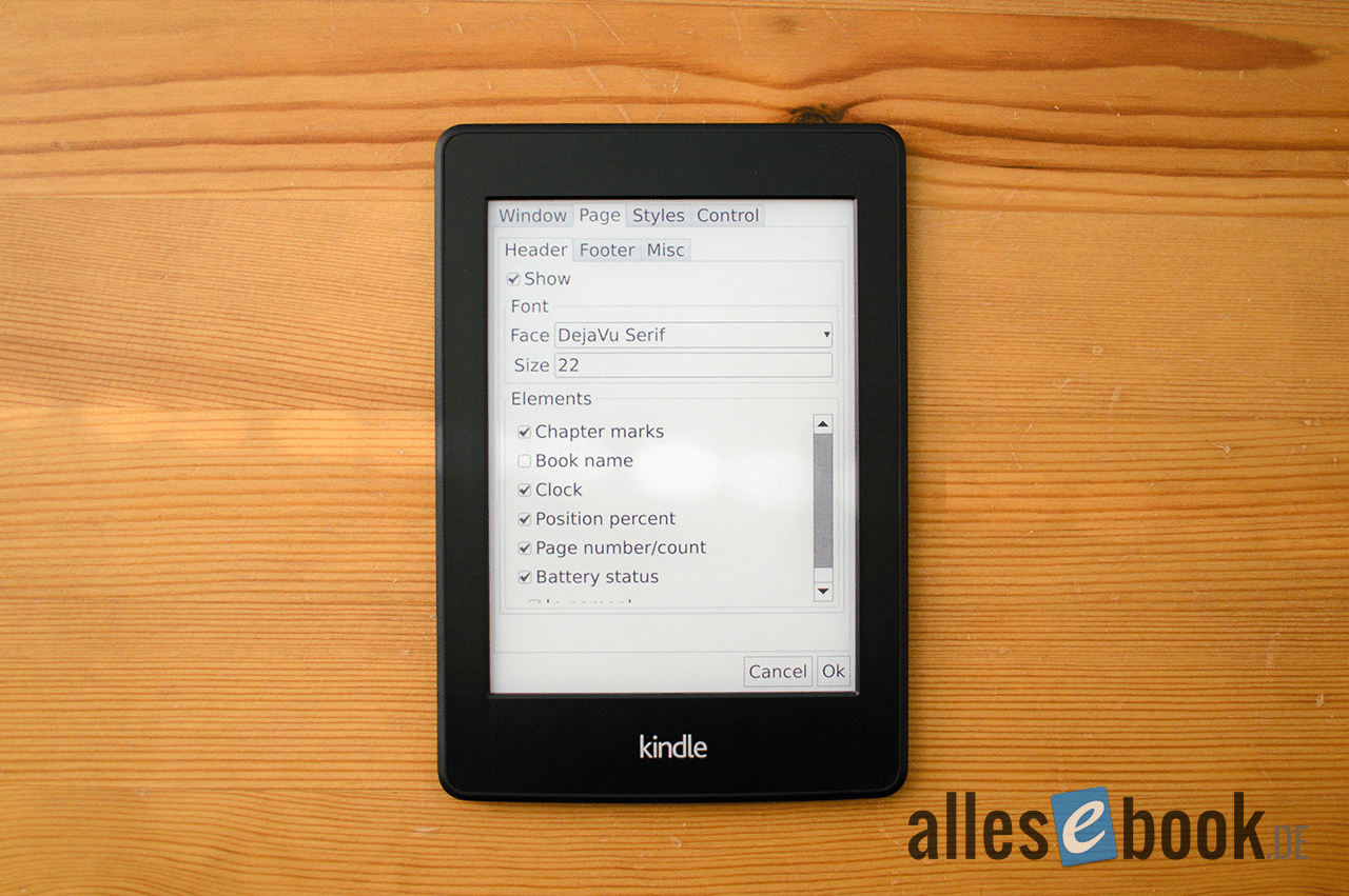 Dabei muss man aber natürlich immer bedenken, dass die Bedienbarkeit von Cool Reader der regulären Paperwhite-Oberfläche in Hinblick auf den Komfort in jedem Fall nachsteht. Das User Interface ist in diesem Fall nicht auf eine möglichst komfortable Touch-Bedienung ausgelegt (funktioniert aber trotzdem tadellos!), sondern einfach auf eine zweckmäßige Anpassbarkeit.