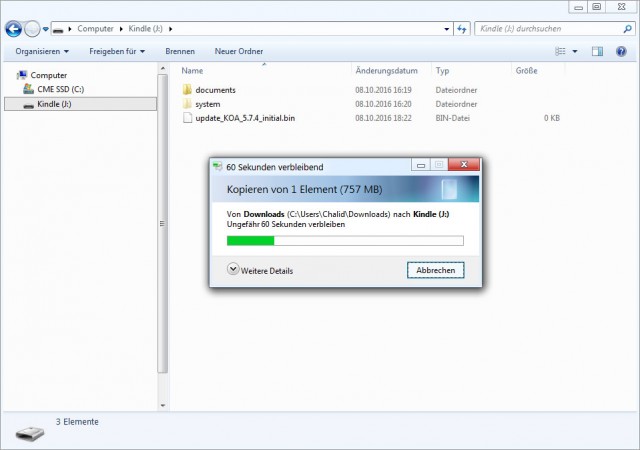 Bei manueller Installation kopiert man die heruntergeladene Datei ins Hauptverzeichnis des Kindle und wählt zum Durchführen des Updates den bekannten Weg über die Geräteeinstellungen (siehe oben). Der Jailbreak bleibt erhalten.