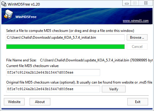 Die errechnete MD5-Summe muss mit derjenigen in der MD5-Datei übereinstimmen.