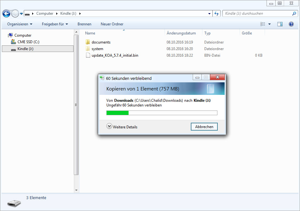 Dazu steckt man den eReader per USB an und kopiert die gesamten Inhalte des „documents“-Ordners an einen beliebigen Platz am Computer. Am Ende des Jailbreakvorgangs kann man den Ordner wieder zurück auf das Gerät kopieren.