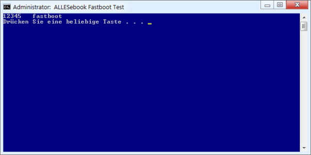 Um zu testen, ob bis hierhin alles geklappt hat, startet man nun die Datei „4_TEST_fastboot.bat“ des Root-Pakets. Die Ausgabe sollte wie im nachfolgenden Bild (Abbildung 3) aussehen („12345 fastboot„). Erscheint nur der Hinweis auf eine beliebige Taste zu drücken (ohne die Fastboot-Zeile) hat die Treiberinstallation nicht funktioniert – in dem Fall geht man zurück zu Punkt 6.