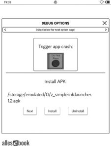Es öffnet sich das Debug-Menü. Wische einmal von rechts nach links, um zur APK-Installationsanzeige zu gelangen (siehe Bild).