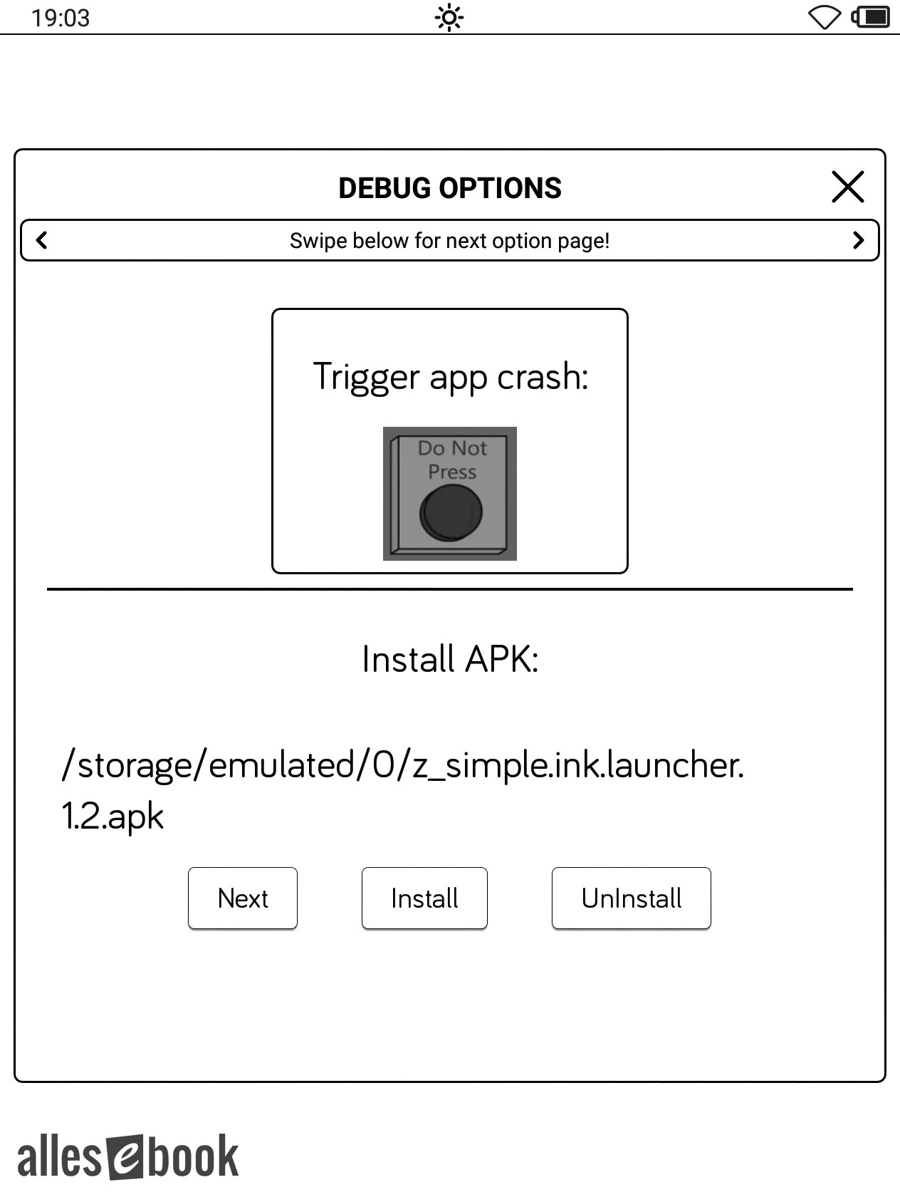 Es öffnet sich das Debug-Menü. Wische einmal von rechts nach links, um zur APK-Installationsanzeige zu gelangen (siehe Bild).