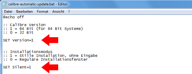 Die Datei „calibre-automatic-update.bat“ lässt sich in zwei Punkten komfortabel konfigurieren. Hierfür muss man die Datei mit Notepad oder einem Codeeditor öffnen und kann die nachfolgend beschriebenen und gezeigten Änderungen in den Kommandozeilen vornehmen.