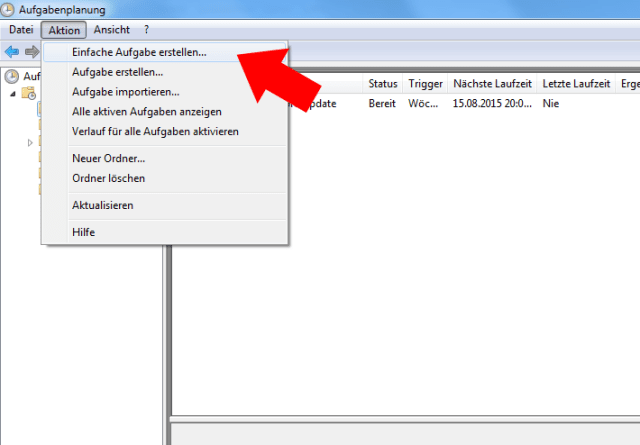 In der Aufgabenplanungsbibliothek kann man nun eine neue Aufgabe erstellen. Das klappt entweder im Hauptverzeichnis oder in einem eigenen Ordner (sinnvoll, wenn man immer wieder Änderungen vornehmen möchte). Über den Menüpunkt „Aktion“ -> „Einfache Aufgabe erstellen“ fügt man das automatische Update hinzu.