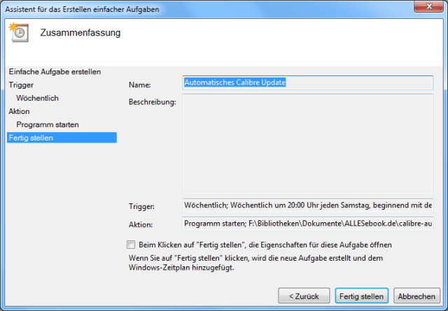 Will man sich in Zukunft auch den Doppelklick sparen, lässt sich die Windows-Aufgabenverwaltung nutzen, um das automatische Update-Programm zu einem selbst definierten Zeitplan auszuführen. Damit läuft die Calibre-Aktualisierung dann tatsächlich ohne weitere Eingriffe ab (sofern die stille Installationsmethode gewählt wurde), denn einmal aufgesetzt, klappt das Update dann ohne weitere Eingriffe.
