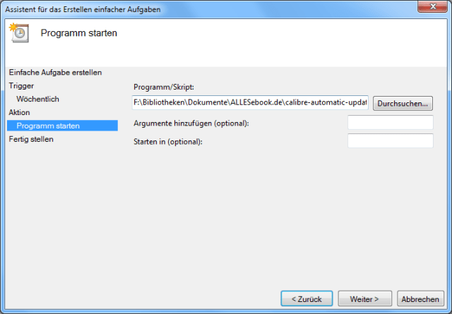 Weiter geht’s mit der auszuführenden Aktion. Hier wählt man „Programm“ um im nächsten Schritt die Update-Datei „calibre-automatic-update.bat“ auszuwählen. Dabei ist es am besten, wenn die Datei in ein Verzeichnis kopiert wurde, das nicht allzu oft geändert wird. So stellt man sicher, dass sie nicht unbeabsichtigt gelöscht wird, wenn man die Festplatte aufräumt oä.