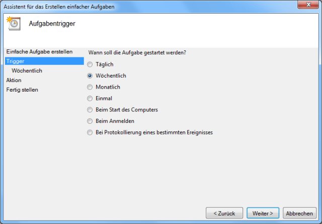 Zunächst tragt man einen beliebigen Namen und eine Beschreibung (optional) ein. Mit einem Klick auf „Weiter“ kann man den Zeitpunkt der Ausführung (Trigger) auswählen. Da Calibre – wie bereits erwähnt – fast jede Woche eine neue Version spendiert bekommt, gehen wir auf „Wöchentlich“.