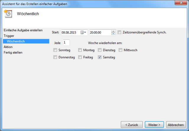 Jeden Samstag um 20 Uhr soll die Aufgabe ausgeführt werden. Wenn man will kann man den Zeitpunkt auch problemlos ändern