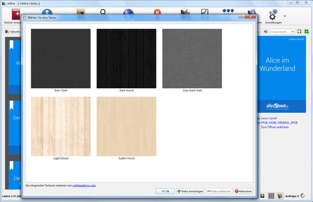 Standardmäßig werden fünf Texturen mitgeliefert, aus denen man direkt auswählen kann. Weiters bietet Calibre die Option eigene Texturen und Bilder zu importieren und ebenfalls auszuwählen. Texturen und Muster sind hier grundsätzlich erste Wahl, da die Fenstergröße bestimmt, wie das entsprechende Bild gerendert und wiederholt wird. In anderen Worten: Wählt man ein „normales“ Wallpaper (z.B. ein Landschaftsbild), wie es häufig auch beim Desktop zum Einsatz kommt, wird dieses je nach Fenstergröße beim Scrollen unschön wiederholt.