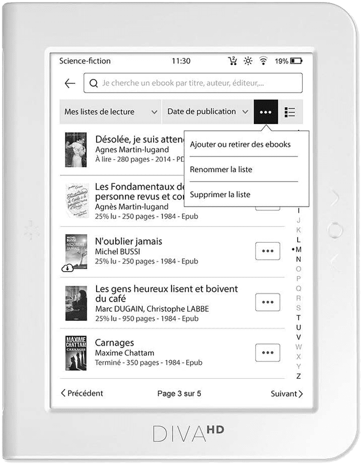 Das Linux-basierte Betriebssystem ist funktional und reagiert schnell. Die Startseite zeigt aktuelle Lesetitel, die persönliche Bibliothek und Empfehlungen aus dem integrierten Bookeen-Shop, der vorrangig französischsprachige Inhalte bietet. Auch die Benutzeroberfläche ist standardmäßig auf Französisch eingestellt, lässt sich aber auf Deutsch, Englisch, Italienisch oder Polnisch umstellen. Neben der Shop-Integration können auch eigene eBooks im EPUB-, PDF-, TXT-, FB2- oder HTML-Format per USB oder Adobe Digital Editions übertragen werden. Der Bookeen Diva HD unterstützt Adobe DRM.