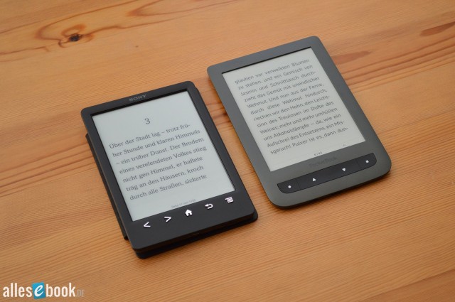 Im direkten Vergleich ist der Unterschied in der Bildschirmhelligkeit deutlich sichtbar, im täglichen Betrieb fällt es hingegen kaum auf. Sony PRS-T3 (links) vs. PocketBook Basic Touch (rechts)