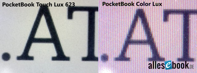 Das nachfolgende Bild zeigt einen Vergleich zwischen PocketBook Touch Lux und PocketBook Color Lux unter dem Mikroskop.
