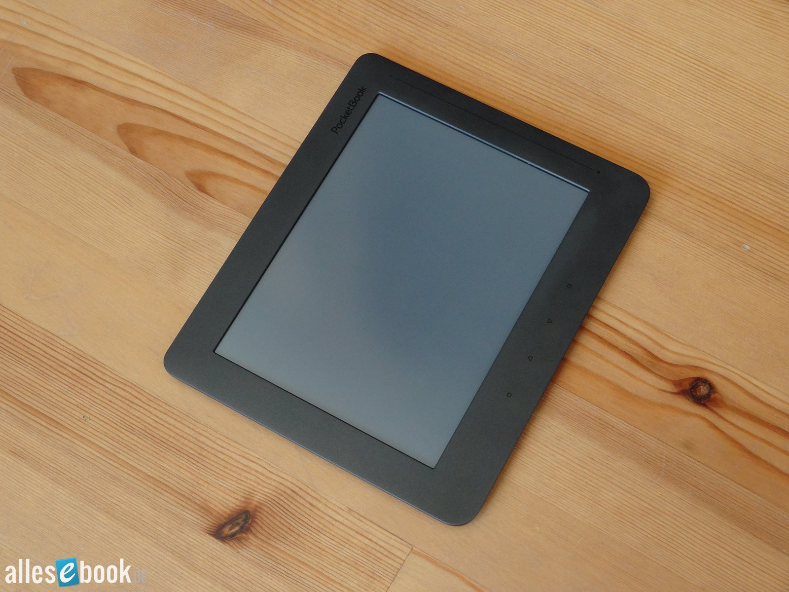 Rechts neben dem Bildschirm befinden sich vier Hardwaretasten: Menü, Vorwärts, Zurück und Home. Die Tasten setzten sich dabei nicht von der Oberfläche ab, d.h. der Druckknopf befindet sich darunter. Dadurch kann man die Knöpfe nicht ertasten und im ersten Moment vermutet man, dass es sich um kapazitive Tasten handelt. Dabei ergibt sich das Problem, dass man relativ genau auf die (eine Spur zu dunkel) aufgedruckten Symbole drücken muss, andernfalls trifft man den kleinen Druckknopf nicht. Hier wären abgesetzte und ertastbare Knöpfe (wie beim PocketBook Touch Lux) wohl die bessere Wahl gewesen – zumindest bedientechnisch. Bei der Optik macht sich das glattgebügelte Design natürlich positiv bemerktbar. Hält man den PocketBook Color Lux in einer Hand und lässt den Daumen direkt über der Vorwärtstaste ruhen, gibt es wiederum kein Problem mit der Bedienung.