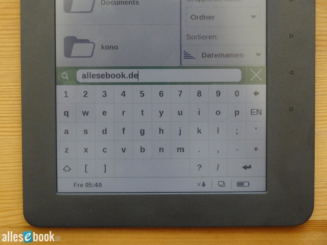 Glücklicherweise wurden beim PocketBook Color Lux auch gleich die Verbesserungen der Software, welche erstmals beim Touch Lux Einzug gehalten haben, mit eingebaut. So kann man im Eingabefeld den Cursor nun einfach mit dem Finger versetzen, wobei ein Auswahlhelfer unterstützend eingeblendet wird und eine fingerfreundliche Bedienung zulässt. Das macht es deutlich einfacher Fehleingaben zu korrigieren als dies früher beim PocketBook Touch 622 der Fall war.