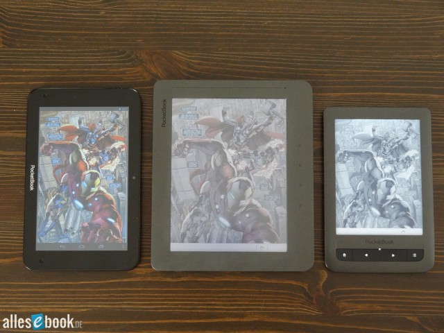 Die Farben des Color Lux (mitte) könnten zwar satter sein, sorgen aber in Natura durchaus dafür, dass man Illustrationen wie hier genießen kann; PocketBook Surfpad 2: links; PocketBook Touch Lux: rechts