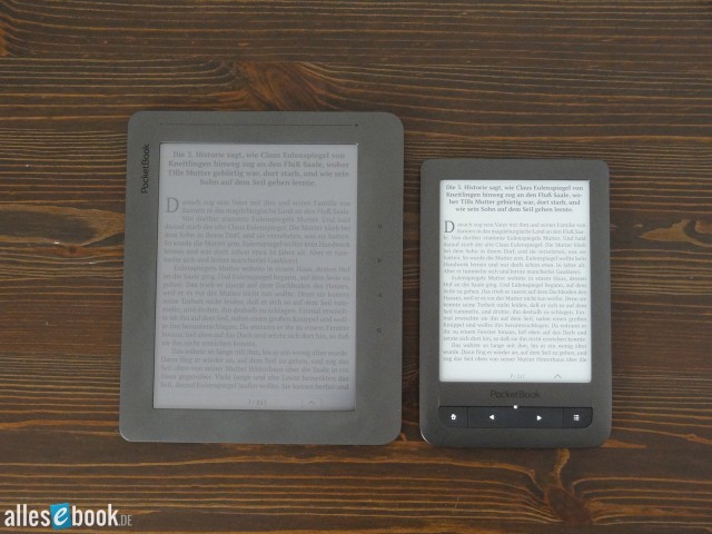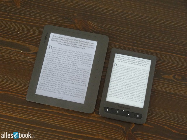 Kommen wir nun zum PocketBook Color Lux: Die Bildschirmauflösung des Geräts beträgt lediglich 800×600 Pixel, was der Mindestauflösung der Triton 2 Technik entspricht. Bei der Bildschirmdiagonale von 8 Zoll resultiert das in einer relativ geringen Pixeldichte von 125 ppi. Der Unterschied zum PocketBook Touch Lux mit 212 ppi ist deutlich sichtbar. Die Schriftschärfe am Color Lux wirkt etwas verwaschener.
