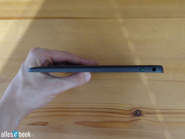 Am rechten Geräterand befindet sich der Micro-USB-Anschluss und der MicroSD-Kartenslot. Beide werden von einer magnetisierten Kappe abgedeckt, welche leicht zu öffnen und zu verschließen ist. Diese Lösung ist hochwertiger als beim Tolino Shine, wo die Abdeckung eher hakelig handzuhaben ist.