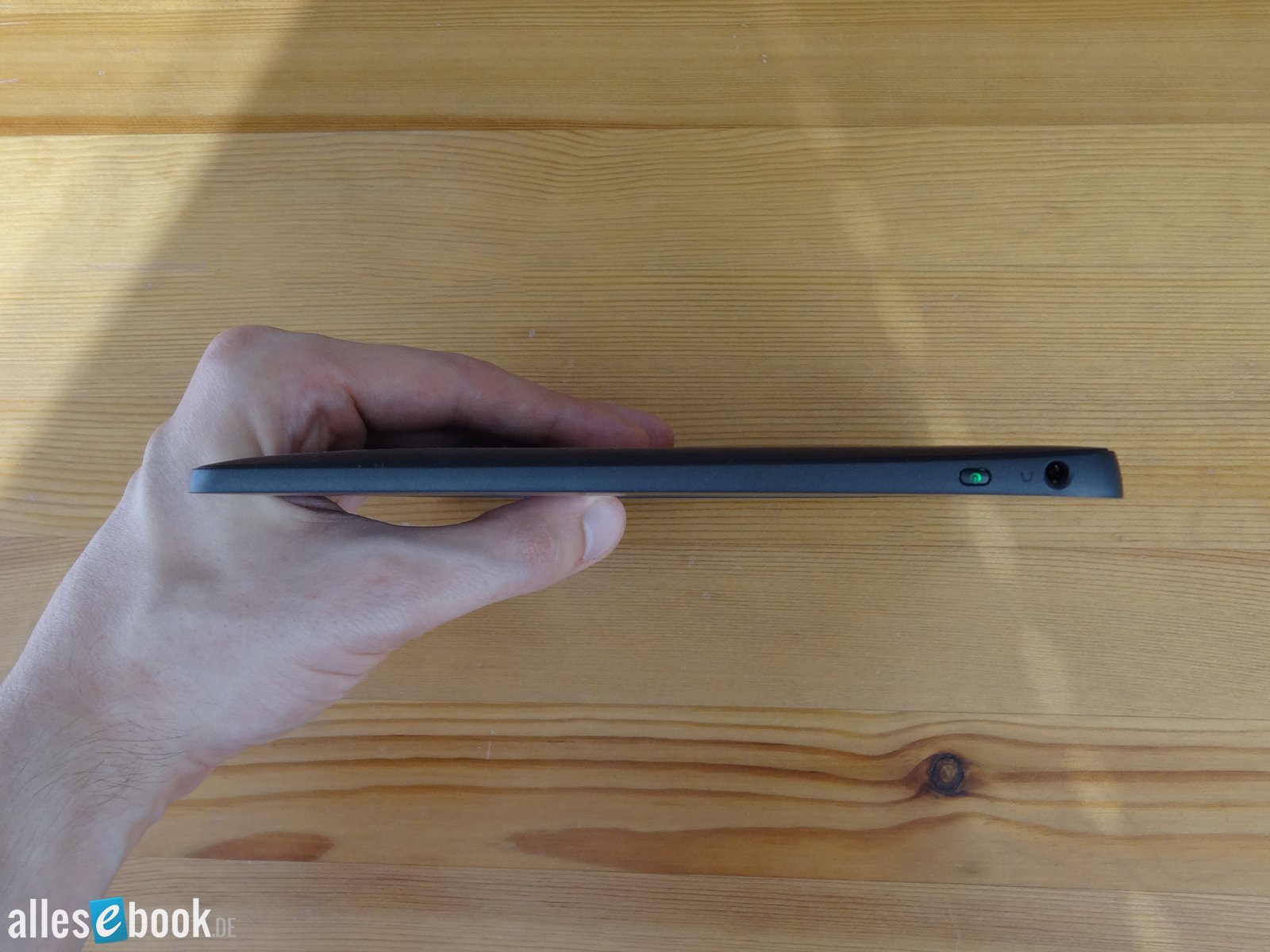 Am oberen Geräterand sitzt der Ein- und Ausschaltknopf, sowie der 3,5 mm Klinkenanschluss. Der Powerknopf ist für meinen Geschmack etwas zu klein geraten, mit einem sehr harten Druckpunkt. Dadurch lässt er sich nur relativ schwer bedienen. Das ist für den laufenden Betrieb aber zum Glück kein allzu großes Hindernis, denn die Taste betätigt man während des Lesens für gewöhnlich sowieso nicht.