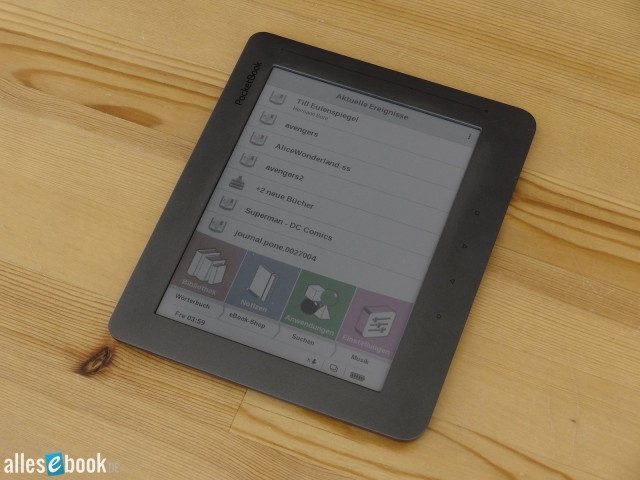Der Startbildschirm präsentiert sich im PocketBook typischen Aussehen: Nüchtern, aber funktional. Im Vergleich zum Touch Lux wurde die Benutzeroberfläche des Color Lux mit ein paar Farben aufgehübscht, was sich zwar nicht auf die Funktion auswirkt, aber dennoch ein netter Bonus ist und der ansonsten tristen Bedienoberfläche ein bisschen Leben einhaucht.