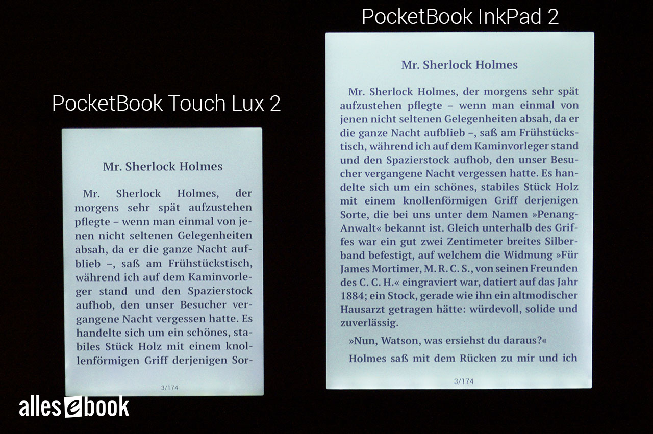 Der PocketBook Touch Lux 2 (links) ist etwas gleichmäßiger beleuchtet. Auch der Kontrast ist besser, was am Foto allerdings nicht so gut zur Geltung kommt wie in Natura.