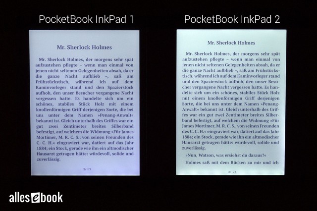 Mit Beleuchtung bleibt das Kontrastverhältnis etwa am gleichen Niveau wie ohne Licht. Mit freiem Auge sind im direkten Vergleich zwischen PocketBook InkPad 1 und 2 wieder leichte Vorteile für das neuere Gerät erkennbar.