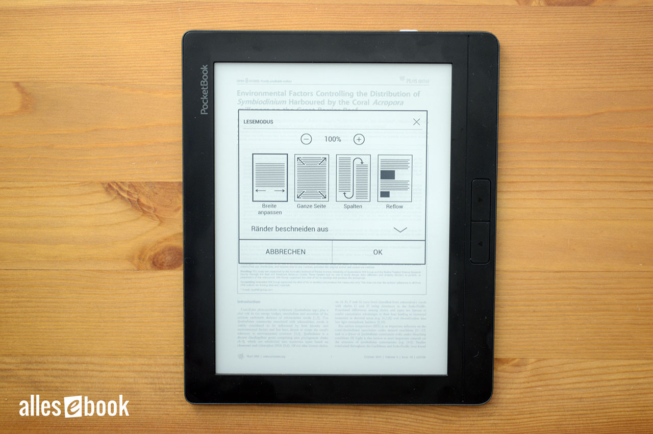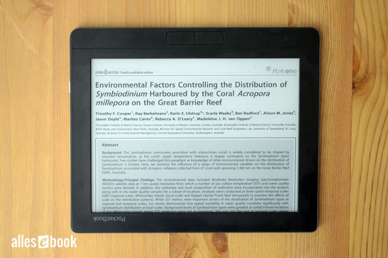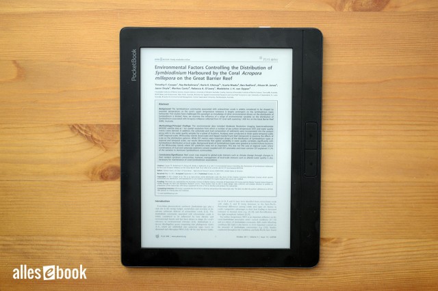 Ein großer Vorteil des 8 Zoll Displays ist auf jeden Fall die bessere PDF-Darstellung. Dank der größeren Bildschirmdiagonale und hohen Pixeldichte können DIN A4 Dokumente im Querformat mit Randbeschnitt beinahe in Originalgröße und auch mit Hilfe der vielen unterschiedlichen Anzeigemodi wirklich sehr gut abgebildet werden. Kein 6 Zoll eReader kann hier mithalten.
