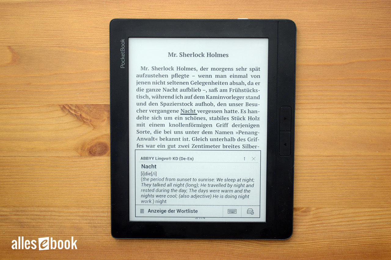 Um das Wörterbuch zu öffnen, sind mindestens zwei Tastendrucke nötig, was weiterhin nicht dem Marktstandard entspricht. Üblicherweise öffnet sich das Wörterbuch direkt (mit einem Antippen), was nicht nur intuitiver, sondern auch schneller ist. Die Wortdefinition wird am Bildschirmrand in einem kleinen Fenster angezeigt. Sollte das gesuchte Wort nicht gefunden werden, wird stattdessen eine Liste mit ähnlichen Wörtern eingeblendet. Alternativ kann man das Wort auch in ein Suchfeld eingeben und selbst nachschlagen.