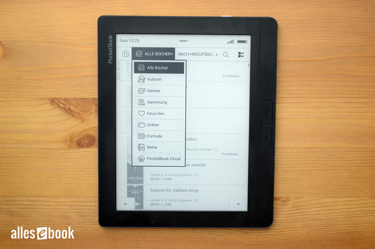Die virtuelle Bibliothek des PocketBook InkPad 2 gehört zu den besten am Markt und bietet zahlreiche Anzeige-, Einstellungs- und Anpassungsmöglichkeiten. In der allgemeinen Übersicht kann man eBooks nach Öffnungsdatum, Hinzufügungsdatum, Titel und Autor sortieren. Zusätzlich kann man die Ansicht nach Autoren, Genres, Sammlung, Favoriten, Ordner, Formate, Reihe und PocketBook Cloud filtern (auf- und absteigend).