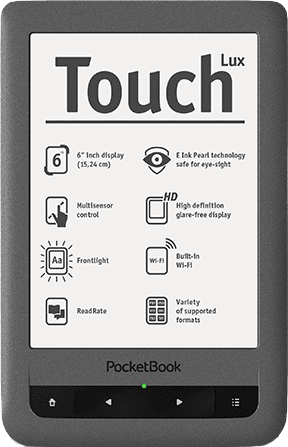 Die Optik und Maße des PocketBook Touch Lux haben sich im Vergleich zum Vorgänger nicht verändert. Der Reader misst 175 х 114,5 х 9,5 mm. Das Gewicht von 198 Gramm liegt zwischen Kobo Glo (180 Gramm) und Kindle Paperwhite (213 Gramm).