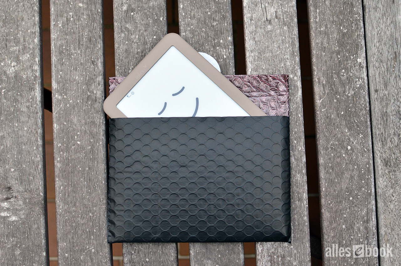 Abschließend ist noch die ungewöhnliche Verpackung eine Erwähnung wert. Im Inneren des hübsch bedruckten Kartons befindet sich der eReader in einer schwarzen Luftpolstertasche. Eine durchaus witzige Lösung, die auch ihre praktische Seite hat: Die Tasche eignet sich ganz gut zum Transport des Geräts.