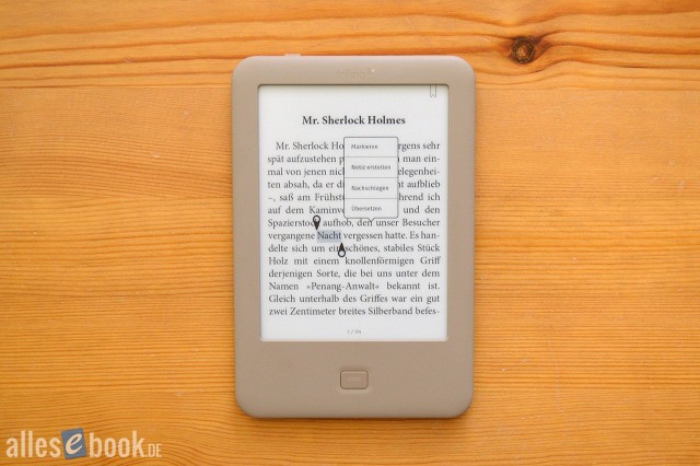 Nicht ganz optimal gelöst ist die weiterhin bildschirmfüllende Ansicht der Wortdefinition. Dadurch ist es nicht möglich den Text direkt nachzulesen und das Wort im Kontext zu verstehen. Bei anderen Herstellern wird die Definition nur in einem kleinen Fenster eingeblendet, sodass der Text im Hintergrund weiterhin ablesbar bleibt. Eine solche Lösung wäre auch hier wünschenswert.
