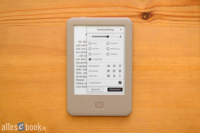 Die Schriftbildoptionen wurden mit Firmware 1.8.0 ebenso verbessert wie die Bibliothek. Neben den neuen Schriftarten Bitter, Source Sans und Vollkorn, sowie den für Personen mit Leseschwäche entworfene Font OpenDyslexic, kann man nun auch eigene Schriftarten in den Formaten TTF und OTF installieren und nutzen.