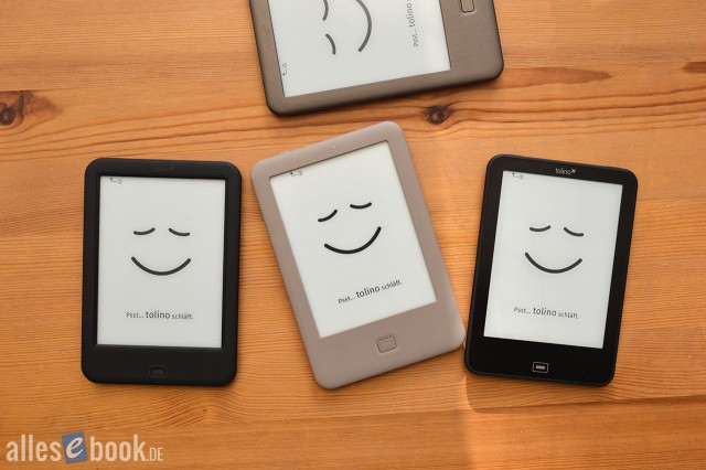 Eine glückliche Tolino-Familie, von links nacht rechts: Tolino Shine 2 HD, Tolino Page, Tolino Vision 3 HD. Darüber: Tolino Shine