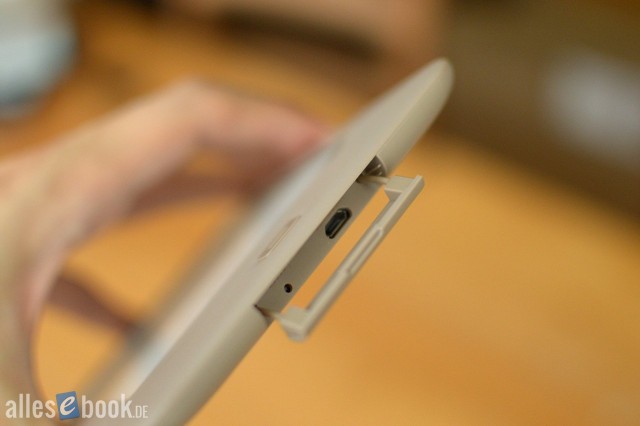 Am unteren Geräterand befindet sich weiterhin die Klappe zum Abdecken des Micro-USB-Steckplatzes. Auf eine Speicherkartenerweiterung muss man verzichten (siehe unten).