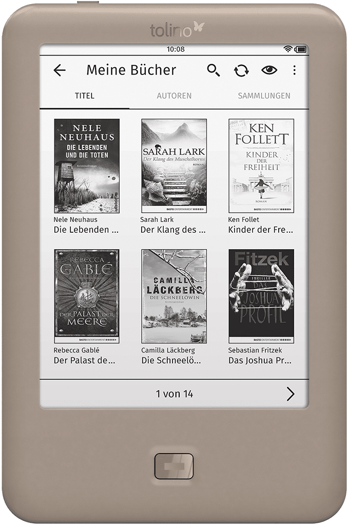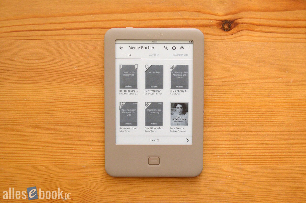 In der Bibliothek lassen sich eBooks in einer Listen- und Kachelansicht nach Aktualität, Titel und Autor sortieren. Neu hinzugekommen (mit Firmware 1.8.0) ist die mögliche Ausblendung bereits gelesener Bücher. Außerdem kann man nun zwischen drei Ansichten nach Titel, Autoren und Sammlungen per Reiter umschalten.