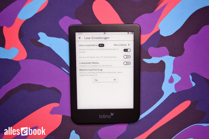 Das „tolino Leseerlebnis“ ist eine alternative Lese-Anwendung die sich in den Systemeinstellungen aktivieren lässt. Diese unterscheidet sich von der regulären Lese-App hinsichtlich Optik und Funktionsumfang aber befindet sich noch in einer Beta-Version.