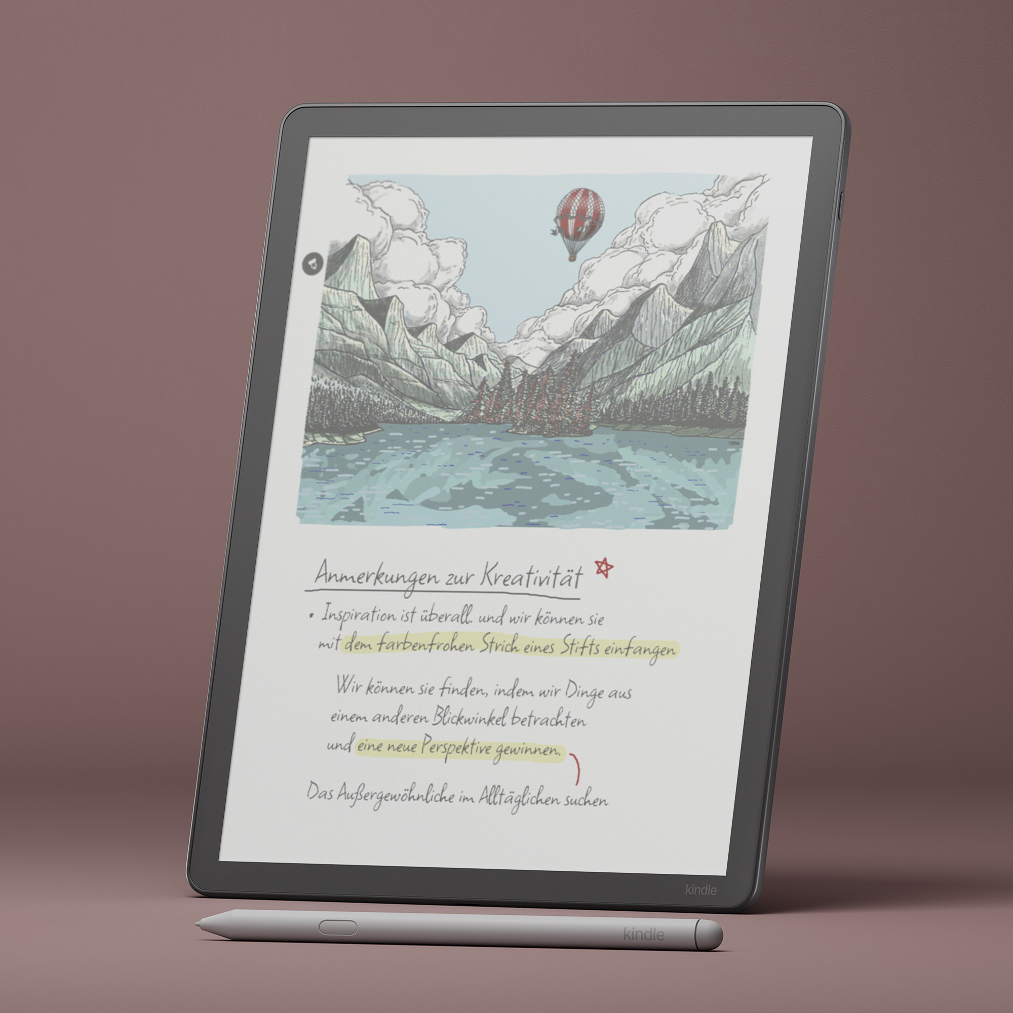 Neu ist beim Kindle Scribe Colorsoft außerdem ein Schattierungstool für feinere Farbverläufe und ein Farbspektrum mit 10 Zeichenfarben und 5 Textmarker-Optionen.