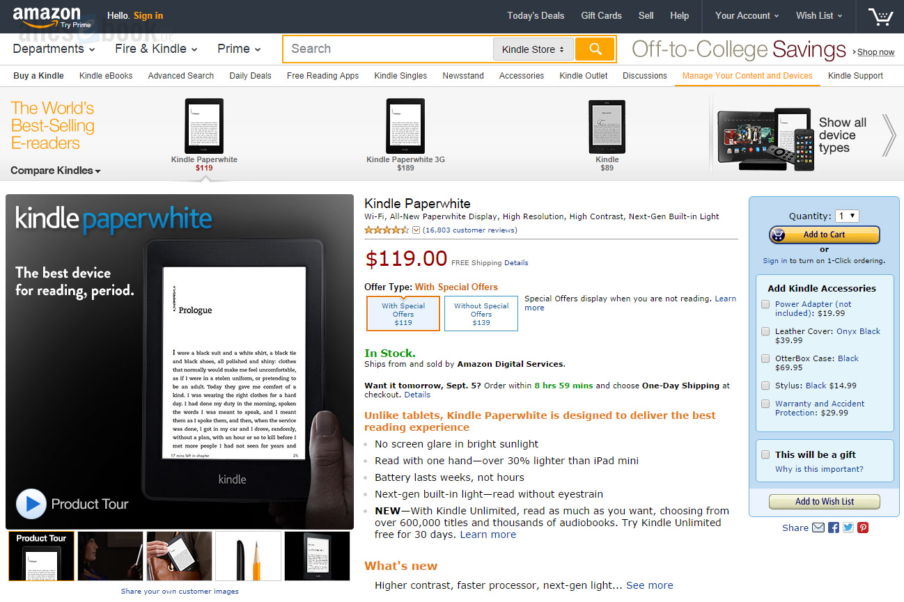 Allerdings rückt Amazon mit dem Redesign die eigenen Geräte und Dienste noch stärker in den Vordergrund als bisher. Anstatt die Kindle eBook Reader, Tablets und Services hinter dem wenig aussagekräftigen und fast schon überfüllten „Kategorien“-Knopf zu verstecken, holt der Onlinehändler die einzelnen Menüpunkte nun aus der Versenkung hervor und platziert sie an prominenter Stelle im Webseiten-Header. Auch den Prime-Dienst will Amazon stärker in den Vordergrund rücken.